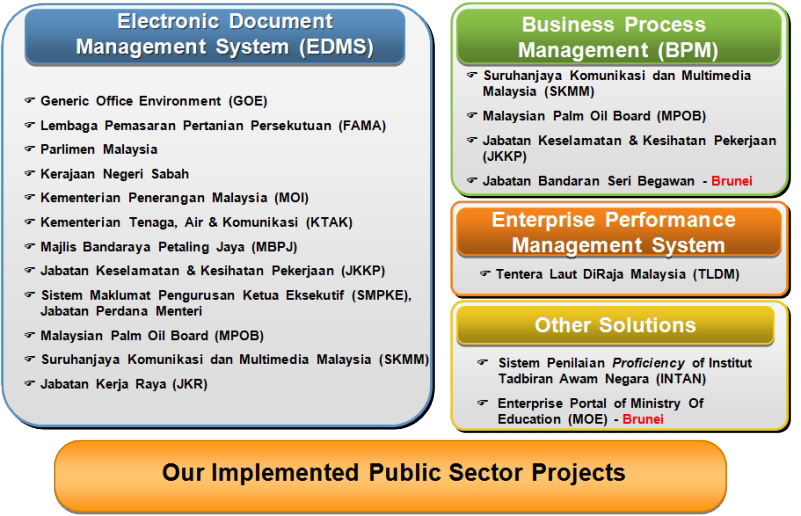 We have initially implemented Electronic Document Management System (EDMS V1) in 5 departments/agencies of Sabah State Government, namely Pejabat Dewan Undangan Negeri Sabah, Bahagian Kabinet dan Dasar, Jabatan Perkhidmatan Komputer Negeri Sabah, Unit Kemajuan IT and Pejabat Setiausaha Kerajaan Negeri. EDMS consists of Hummingbird DM 5.0, Hummingbird DM WorkFlow 5.0 and Hummingbird Imaging. We have subsequently rolled out to another three departments/agencies, which are Kementerian Kewangan Negeri Sabah, Pejabat Hal-Ehwal Dalam Negeri dan Penyelidikan and Unit Fail Jabatan Ketua Menteri. We have completely re-wrote (or developed) the interface module to match the users' requirement and standards of operations for EDMS V2. With our EDMS and the Reinventing Government by the staff of Sabah State Government, we have streamlined the correspondence process and standardized the filing process. We also provide Hummingbird Site License - Unlimited Servers and Clients License for EDMS.